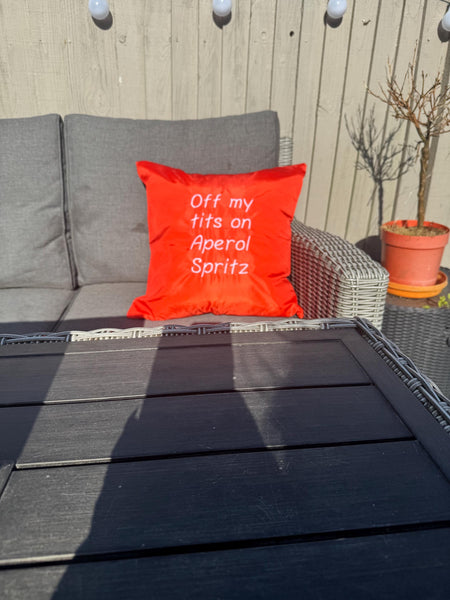 Orange square outdoor cushion cover with ‘Off my tits on Aperol Spritz’ embroidered in white.