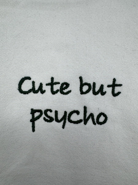 White tote bag with ‘cute but psycho’ embroidered in green.
